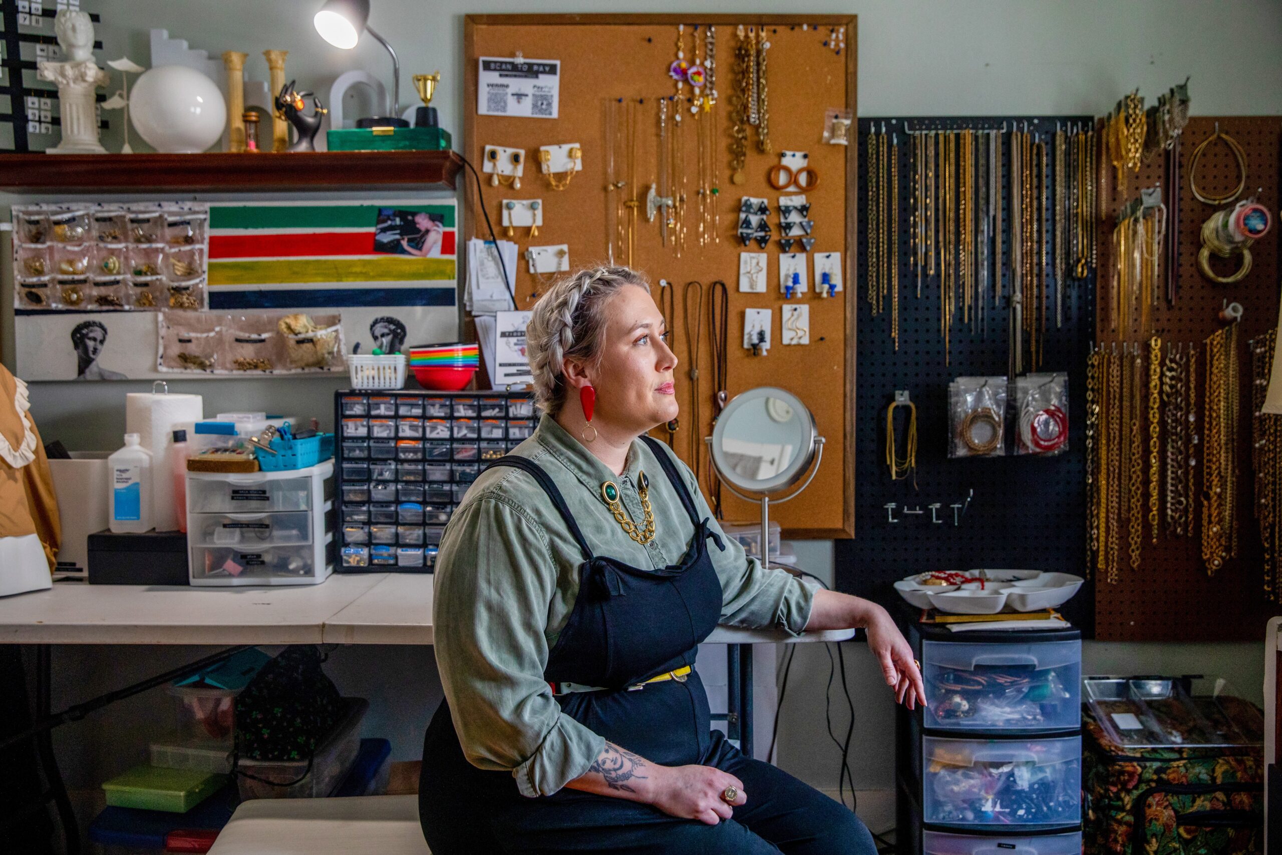 The construction process varies per piece, taking anywhere from two hours to two days to complete, which she balances with her full-time job as a talented theater teacher at Woodlawn High School. And the sourcing takes time, too. Stockwell scours estate sales and thrift stores—even sometimes a friend or family’s closet—for accessories she can dissemble and give a second life to.