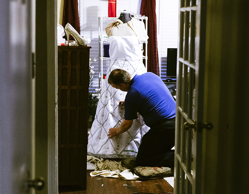 A week before the big event, Gould is up all night applying Swarovski crystals and beadwork to his shimmering gown. His heavy, sparkly crown sits in its box next to the platform heels he’ll wear. With the ball’s theme of Viva Las Vegas, Gould says he’s most excited for his guests to see him walk the stage in his finished gown and silver, feathered backpiece. After the court’s procession, he’ll likely ditch the heavy accouterments and enjoy the rest of the night.