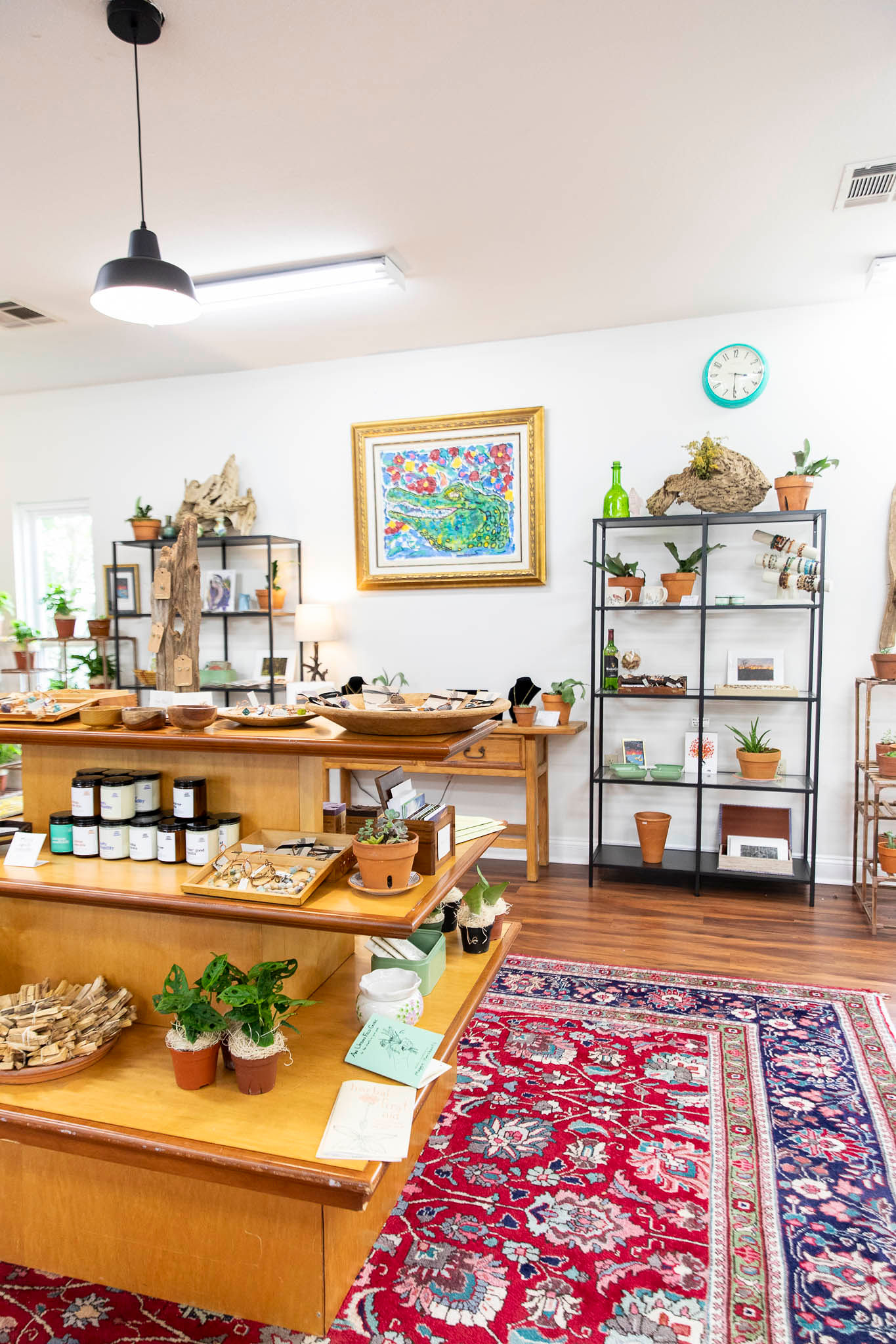 The shop features works by established regional artists like Amanda Takacs of Burned in Time, Mattea Studio in Lafayette and the popular Baton Rouge-based jewelry line, Mimosa Handcrafted, as well as numerous emerging local artists. Shelves are also lined with home decor, handmade candles, soaps, birdhouses and branded T-shirts that the couple screen prints with their logo. They use second-hand shirts to demonstrate a commitment to recycling.
