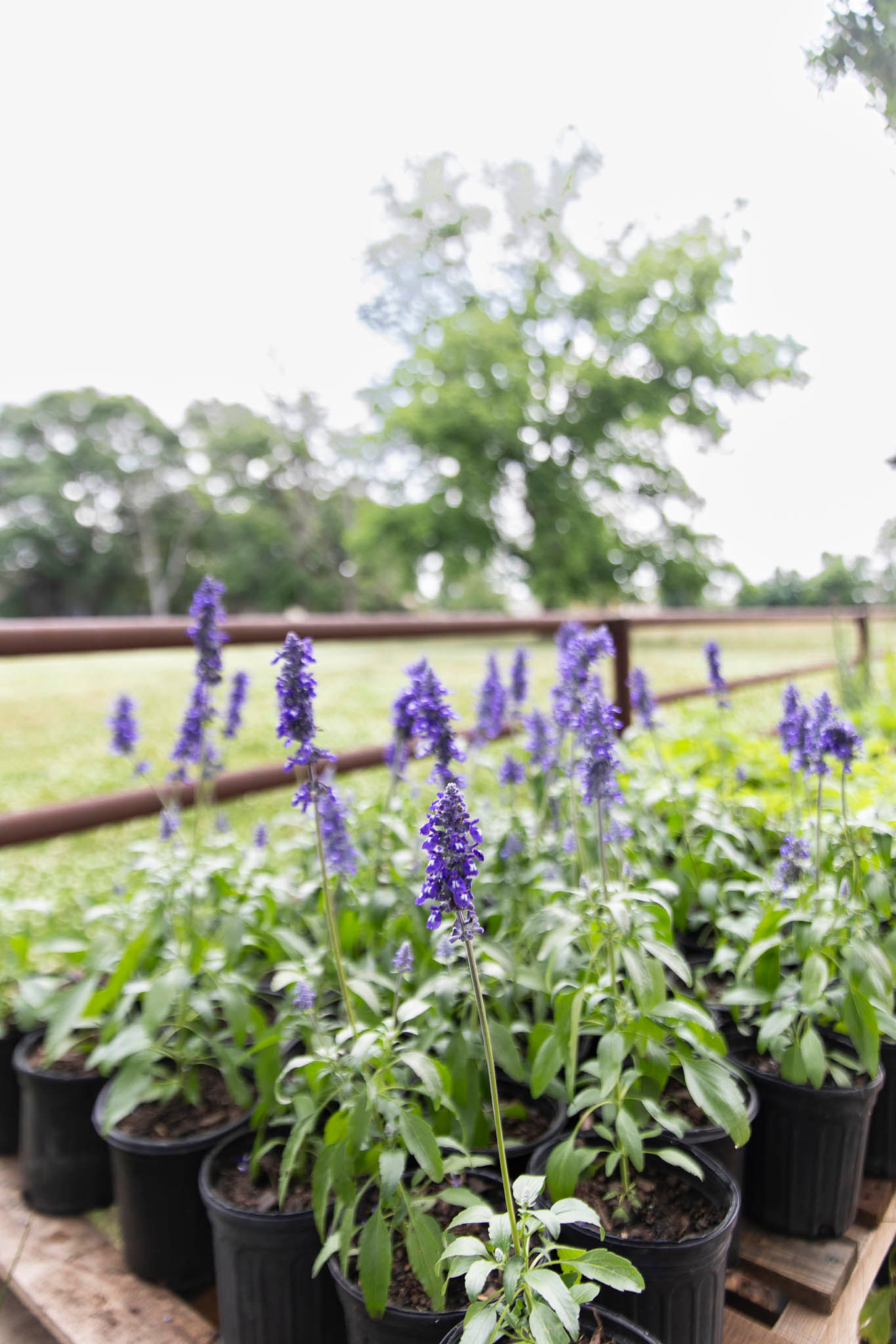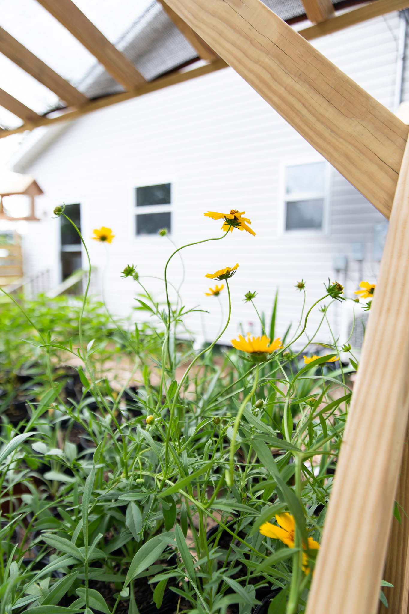 The outdoor nursery features tidy racks and rows of flowering plants, shrubs, grasses and others situated on stands the couple made from reclaimed wood.