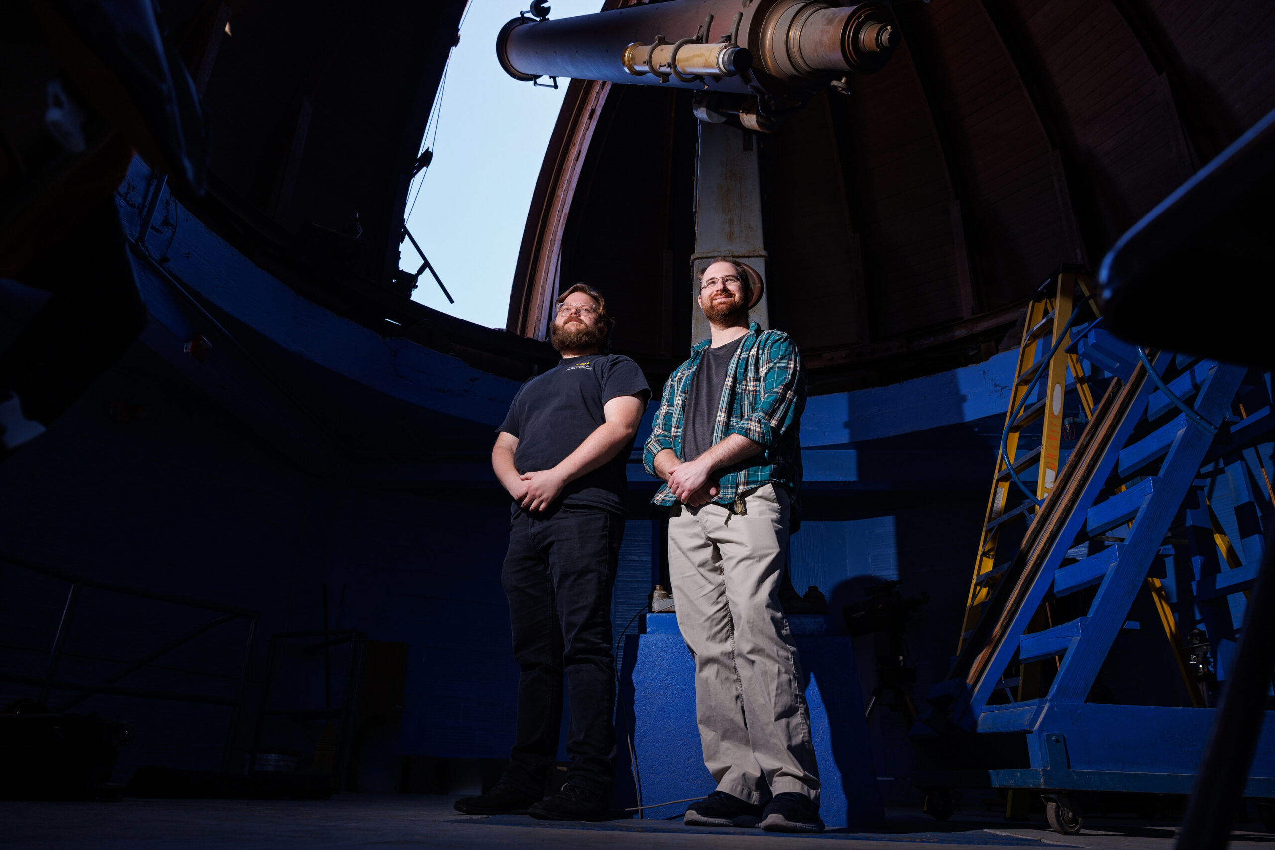 Attendees climb three flights of stairs to the observatory, taking in its simple grandeur and rudimentary operations. Before they arrive, Turley and graduate assistant Eric Borowski play analog astronomers, cranking open the dome to reveal the night sky, and setting the telescopes to the right coordinates for optimum viewing.