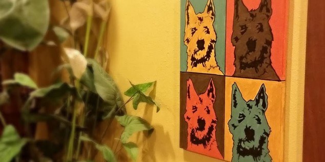 The concept is simple: Send Create Studios a photo of your pet, and they’ll print a stencil for you to use in class. Your final painting will consist of four panes complete with the bright colors typically associated with the pop art style.