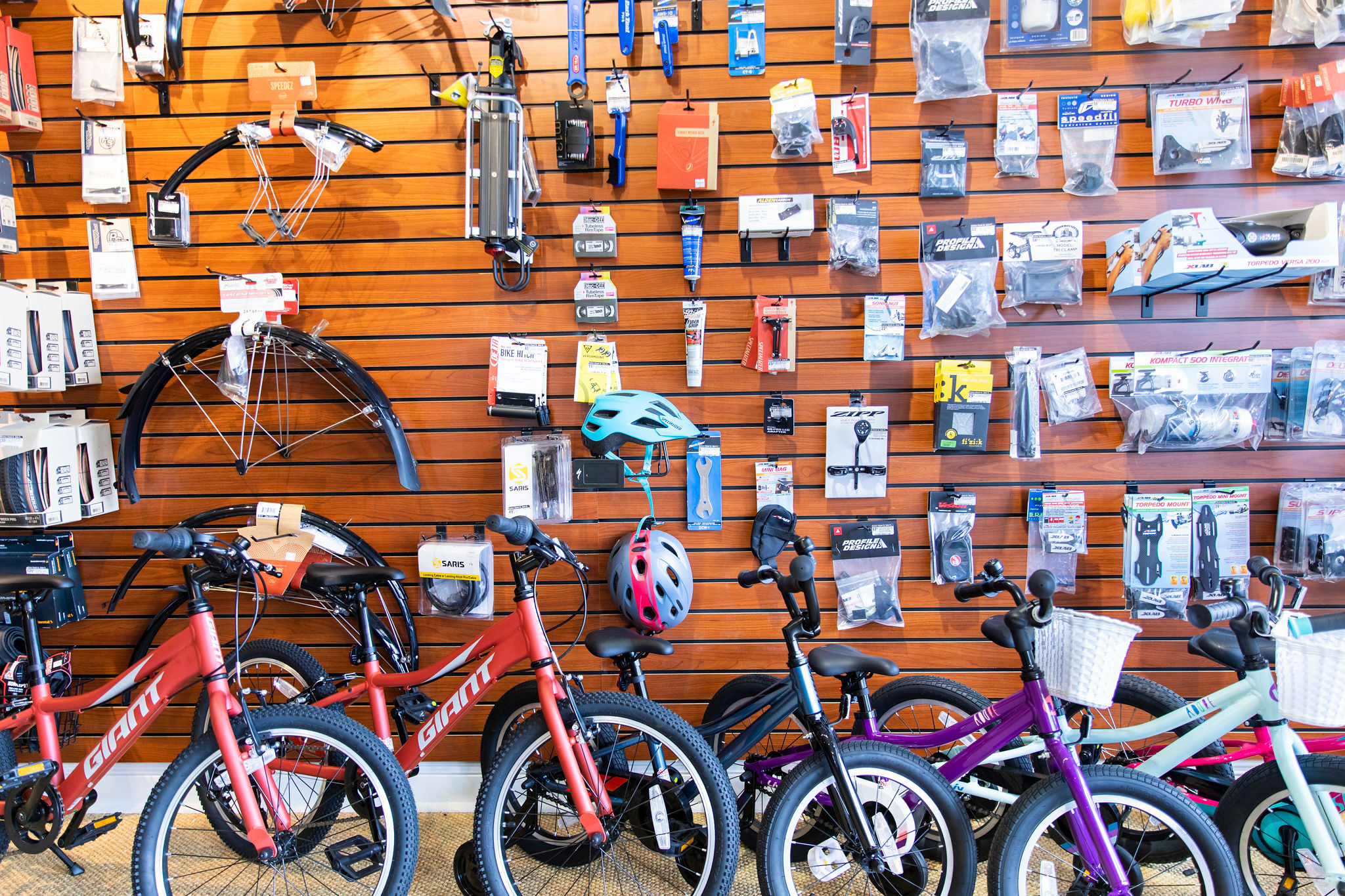 The store carries bicycles and bike parts from an array of brands such as Specialized and Cervelo. The front of the shop displays cycling products ranging from apparel and accessories like helmets to nutrition products and YETI tumblers.
