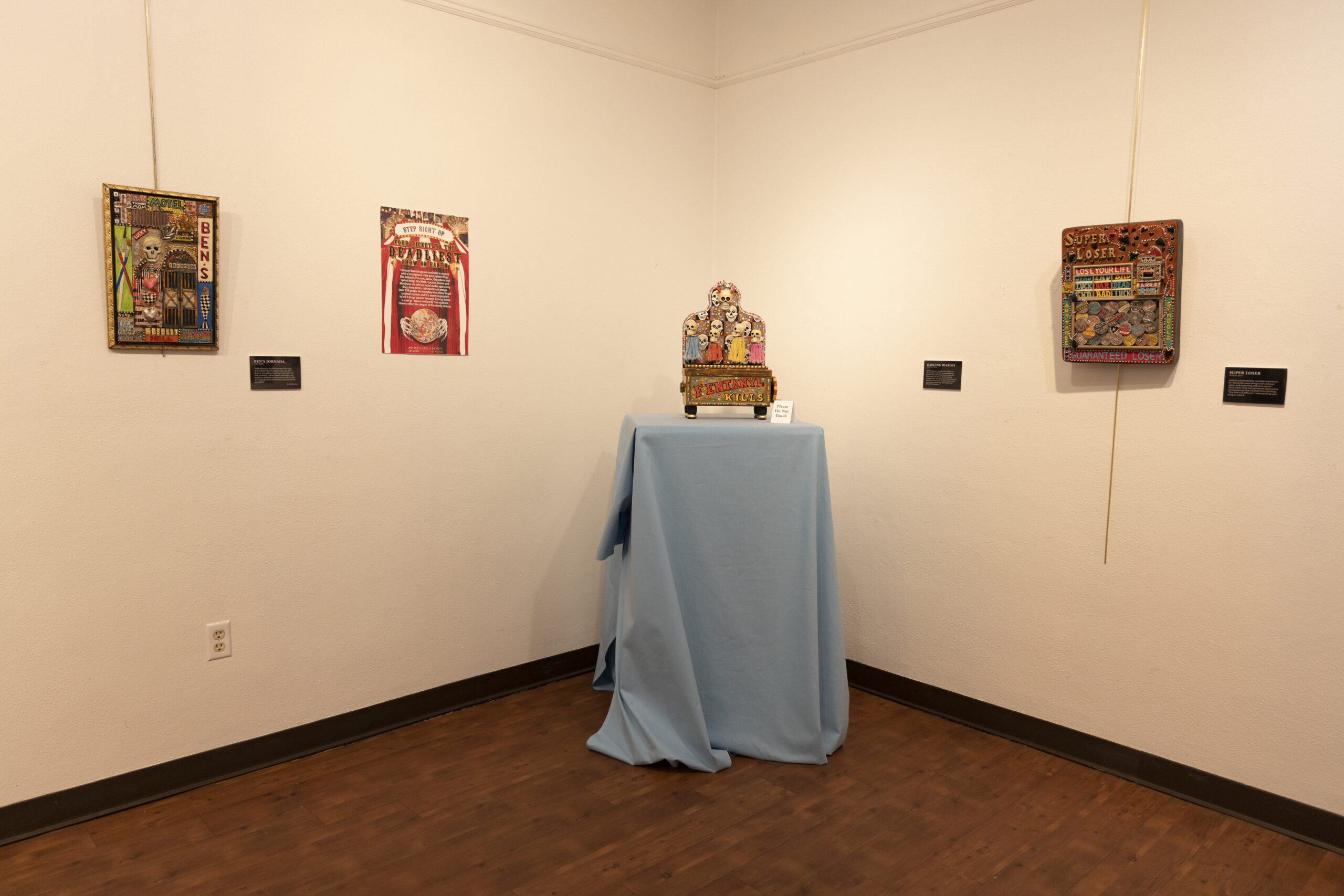 Viewers can also see his “Your Ticket to the Deadliest Show on Earth,” a three-dimensional piece that focuses on emojis the Drug Enforcement Administration has said are the most commonly used by those ordering drugs online. Its caption reads: “Fentanyl-laced drugs are available to anyone with a smartphone.”