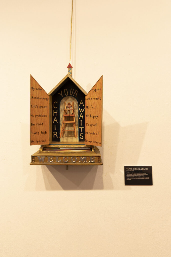 Each piece in the exhibit took Peabody about a month to three months of daily work to complete. He says he won’t sell the exhibit artwork, and wants to continue using them to share recovery stories and increase addiction awareness.