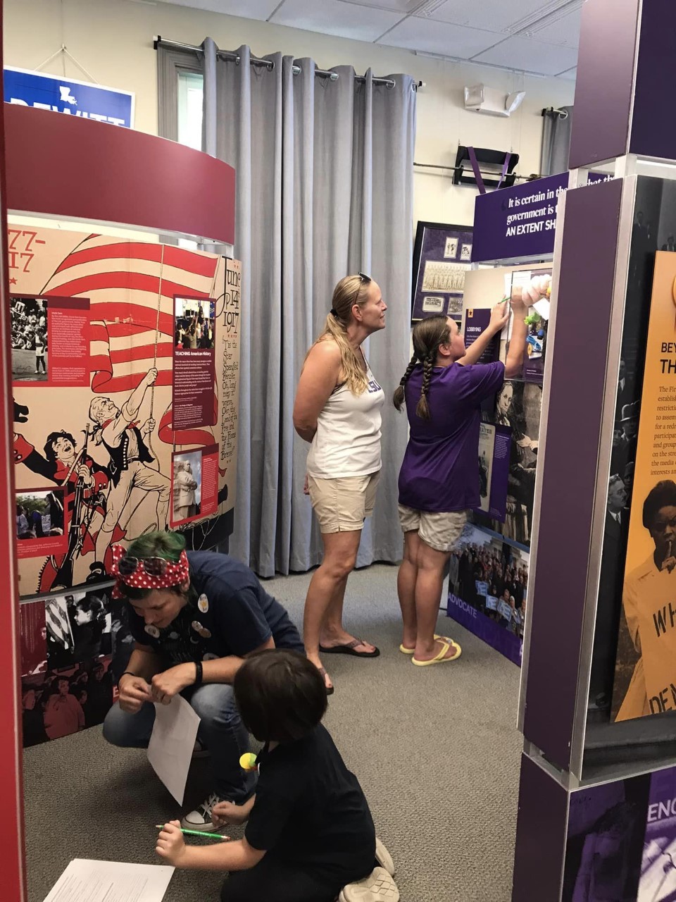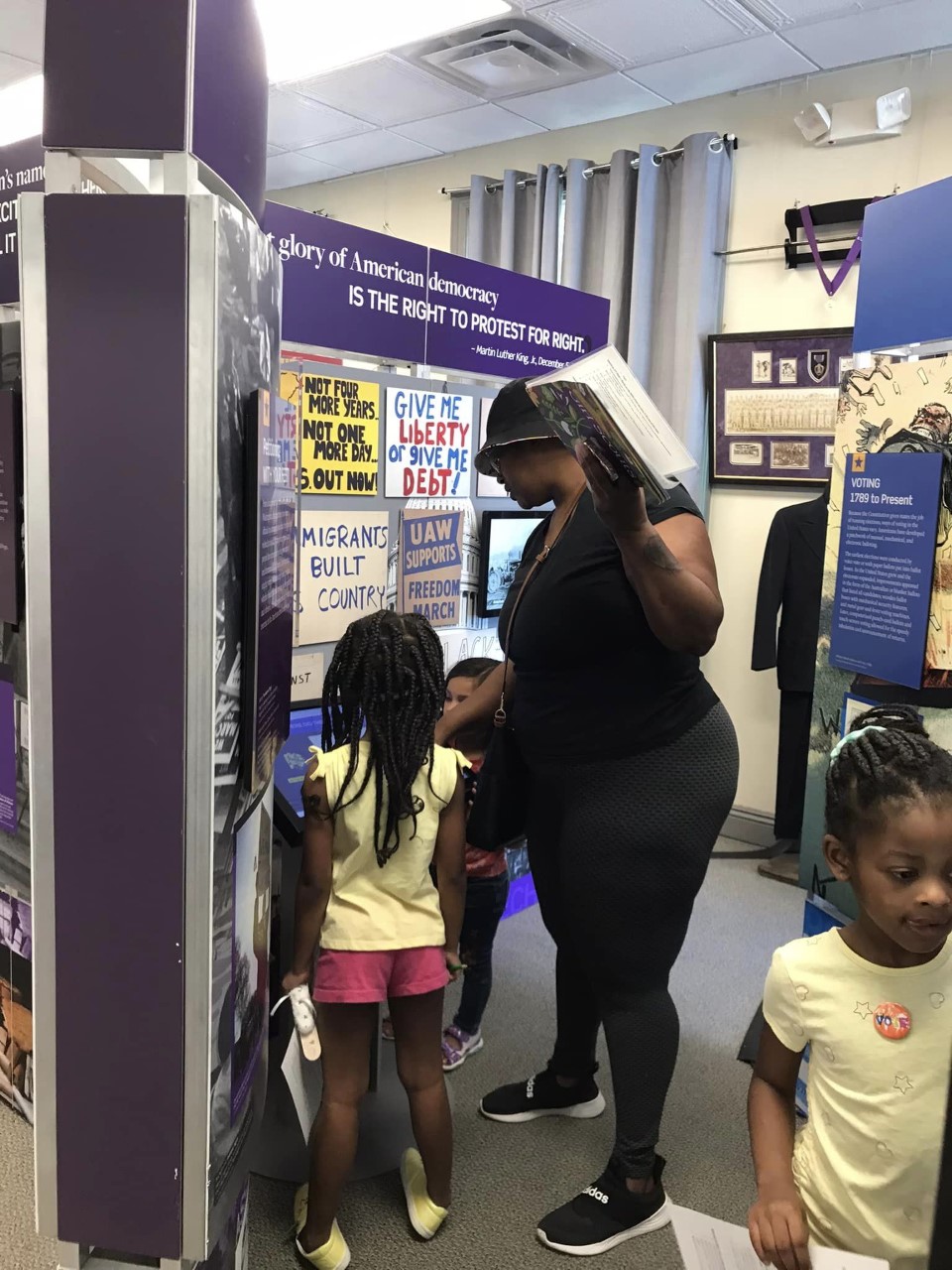 To begin, a portion the exhibit called “The Great Leap” tells the events that inspired the writing of the Declaration of Independence and the Constitution. It addresses questions like, “Who is included as ‘the people?'” and “How would their voices be heard?” Next, “A Vote, A Voice” moves the viewer through the evolution of voting rights and the fight for fair representation in America.  Other parts of the exhibit address how the political parties were formed, Americans’ right to peaceably assemble and petition, and their responsibilities as citizens.