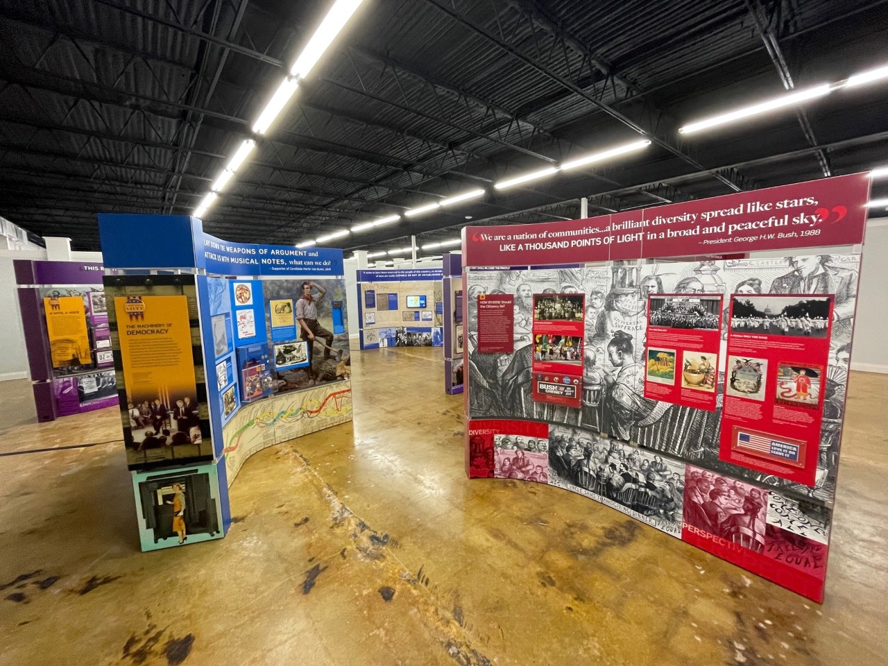 “Voices and Votes” takes viewers through the almost 250-year-old American journey of democracy, moving through multiple themes to help viewers visualize this journey.
