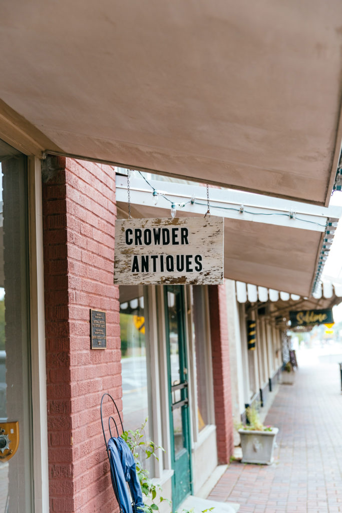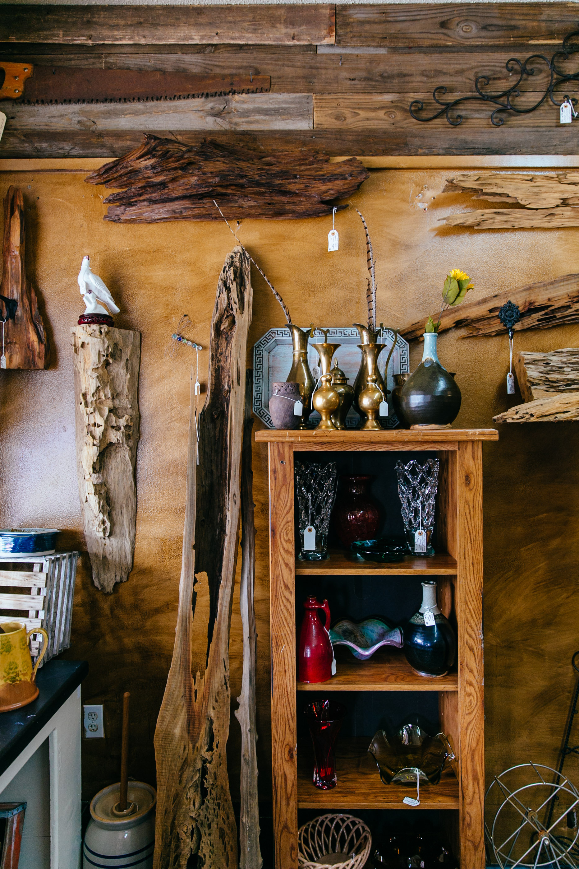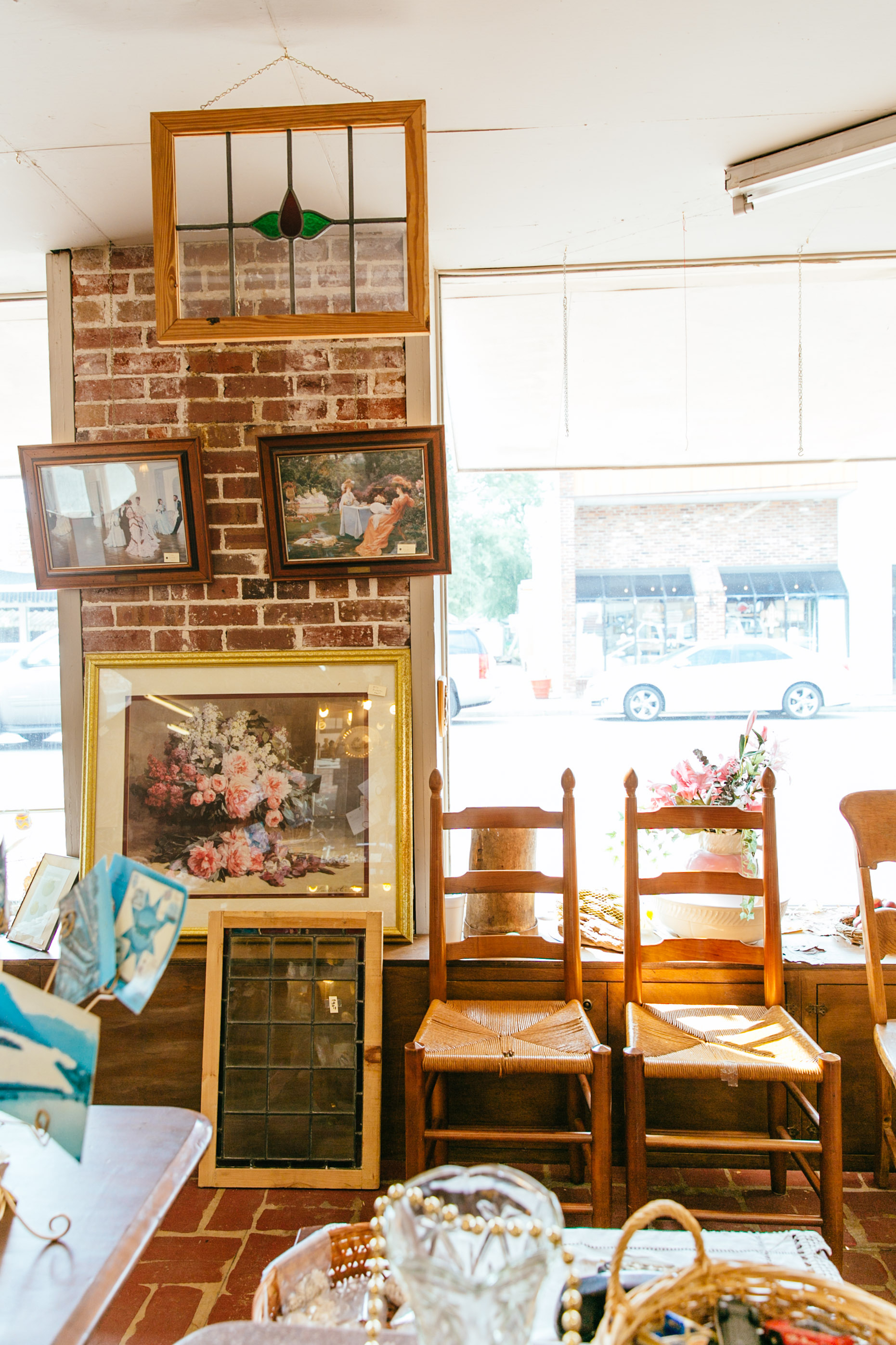 From left to right: Antique shopping on the streets of Denham Springs; A treasure trove of finds on the ground floor of Crowder.; Meticulously curated objects at The Gilded Sparrow.