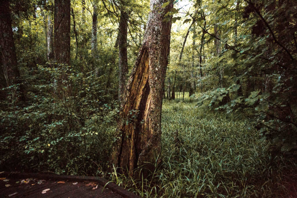 Still, I shrug my rain jacket on in case the day’s downpours make a return, and my photographer and I step onto the boardwalk path toward the nature center, which is nestled just inside the swamp.