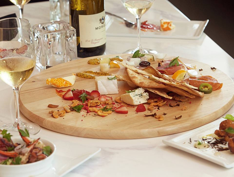 - First course: Roasted garlic and pistachio bruschetta with gorgonzola, fig compote, olive oil and Parmesan chip, paired with Lamberti extra dry Prosecco.